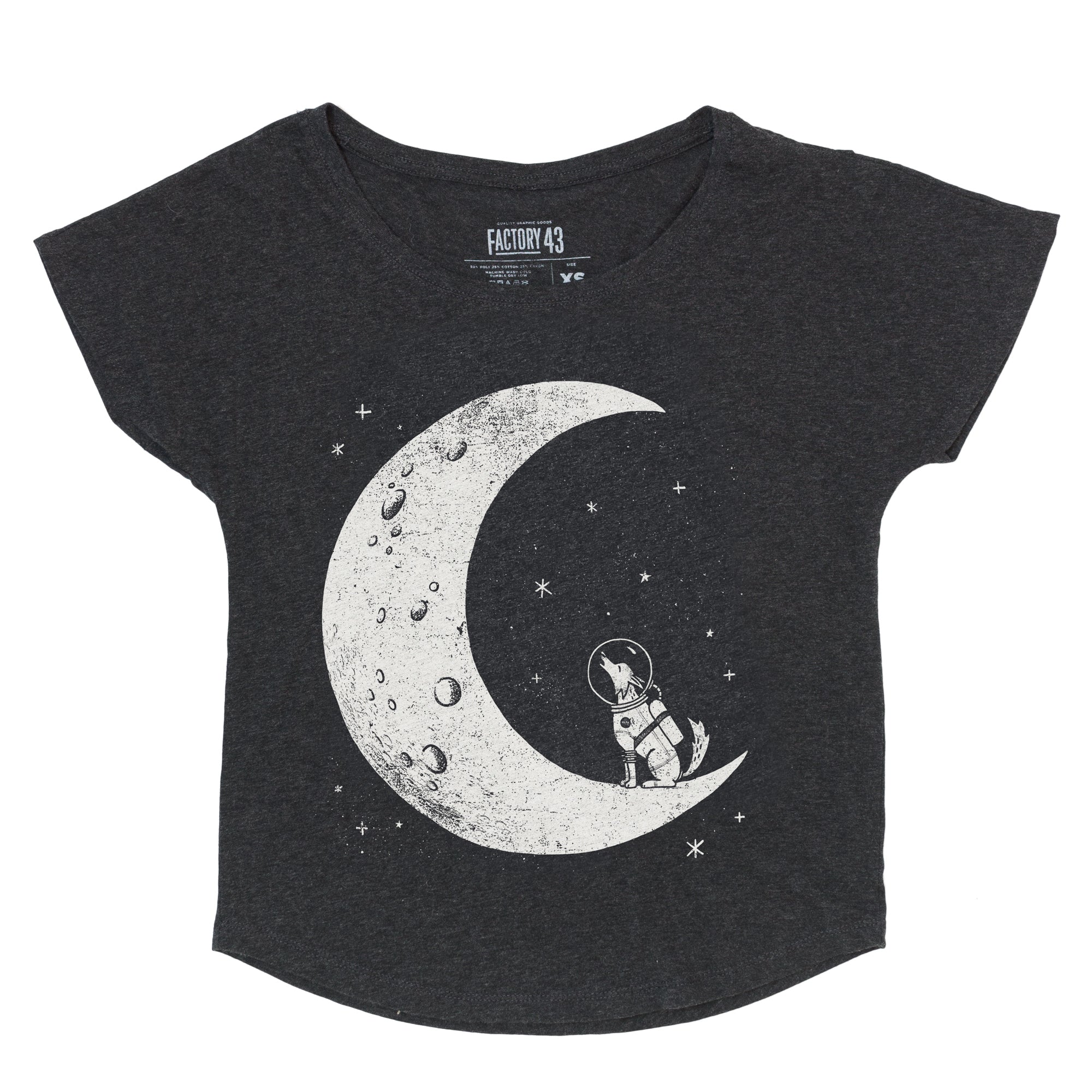 Super-soft women’s dolman triblend tee in Vintage Black. Discharge print 3.8 oz., 50% polyester, 25% combed and ringspun cotton, 25% rayon blend
